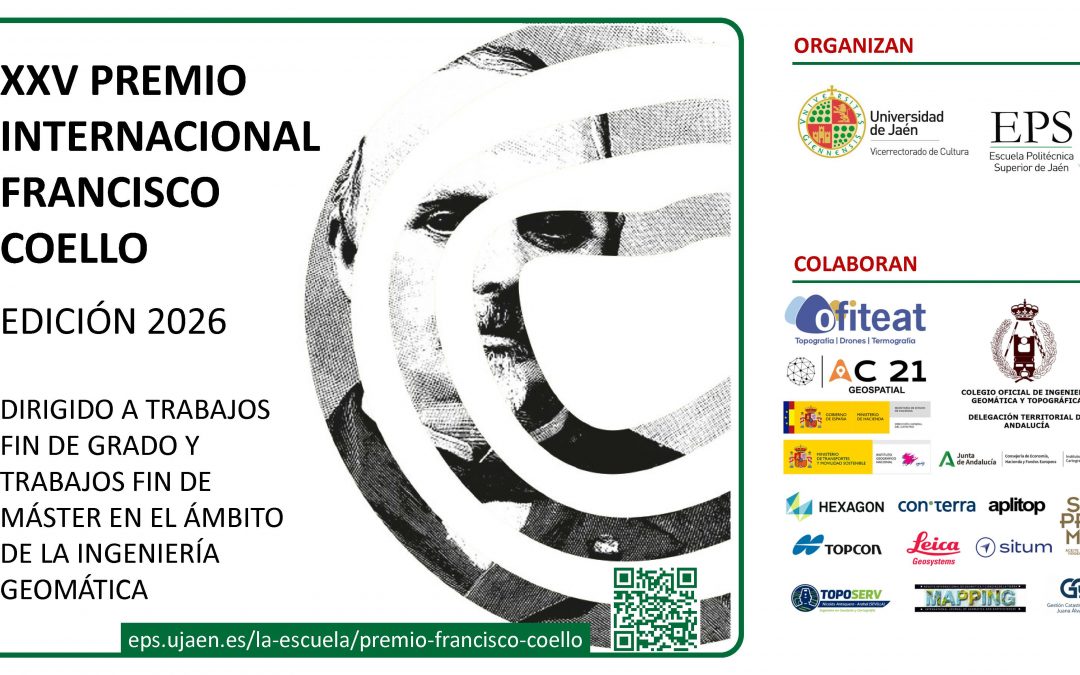 Abierta la convocatoria de la vigésimo quinta edición del Premio Internacional Francisco Coello dirigido a Trabajos Fin de Grado y Trabajos Fin de Máster en el ámbito de la Ingeniería Geomática, promovido por la Escuela Politécnica Superior de Jaén y el Vicerrectorado de Cultura de la Universidad de Jaén.
